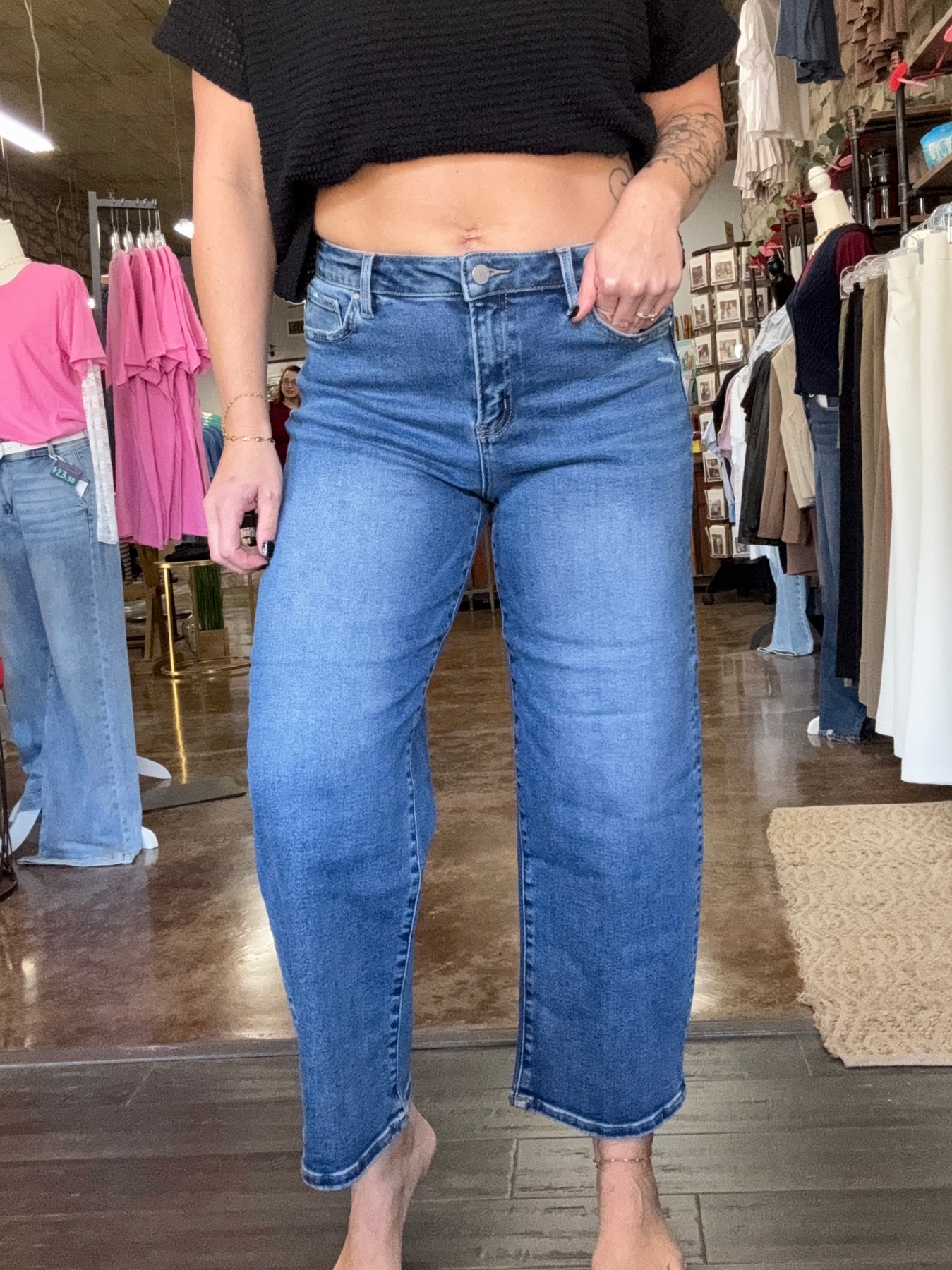 The cropped length and subtle taper at the ankle create a flattering shape that pairs perfectly with sneakers, sandals, or heels. Crafted from a soft stretch denim blend, these jeans provide structure through the waist and hips with just enough flexibility for all-day wear.