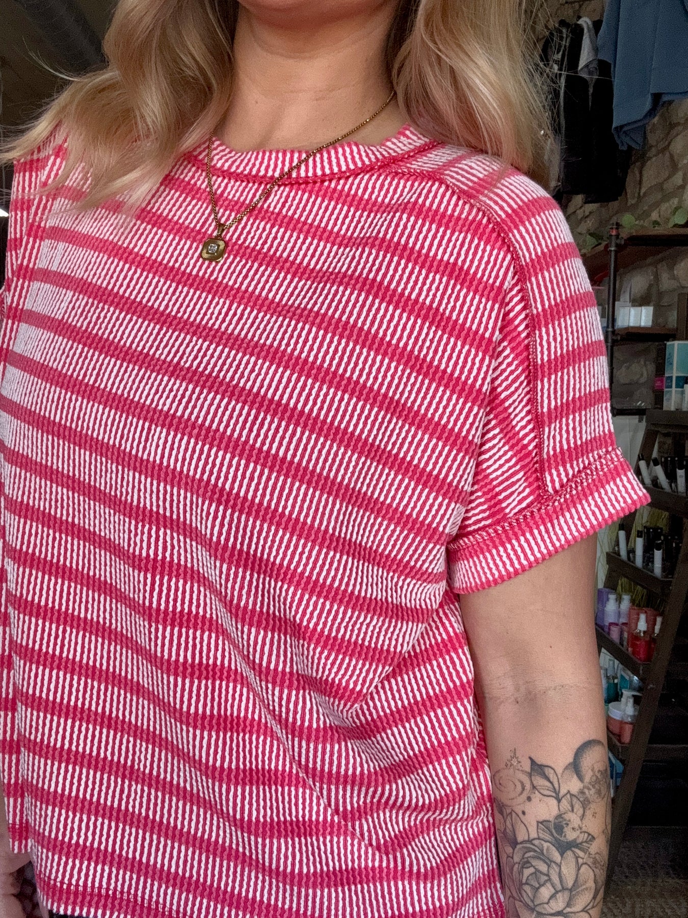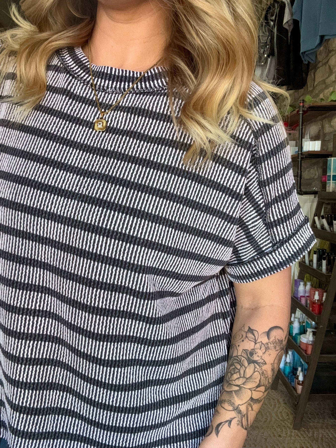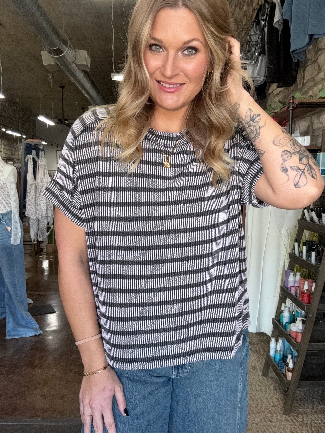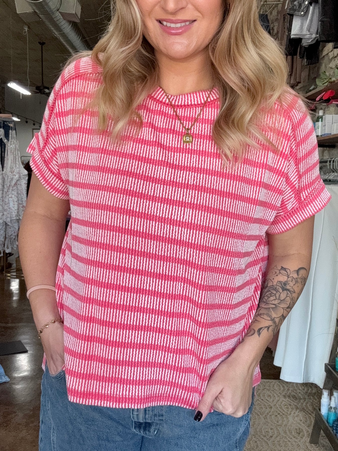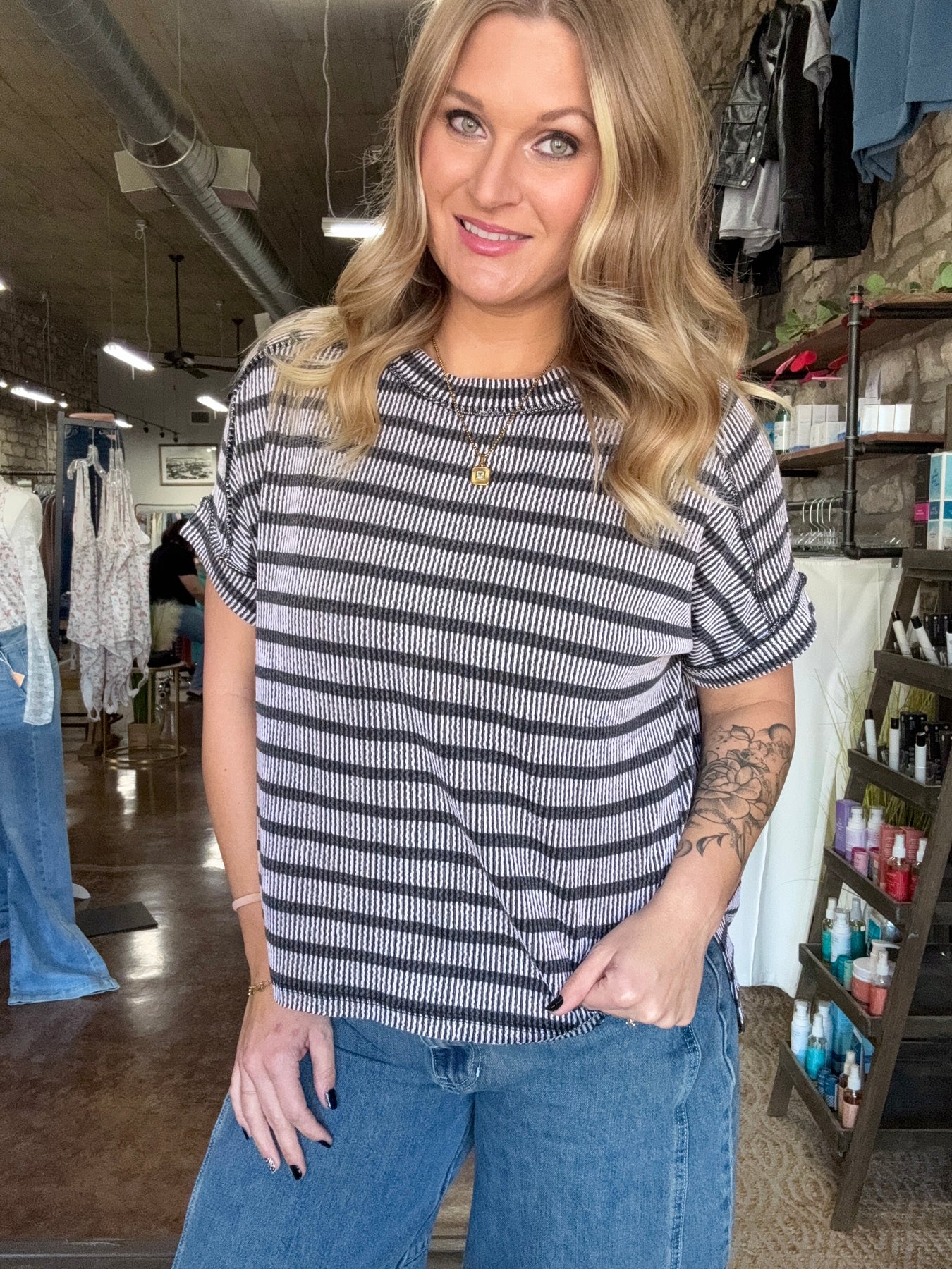 Add effortless texture and casual style to your everyday wardrobe with our Raised Rib Striped Top. Designed with a soft ribbed fabric and subtle stripe pattern, this top features exposed seam detailing, side slits, and a hi-low hem for an easy, relaxed silhouette that flatters without clinging.
